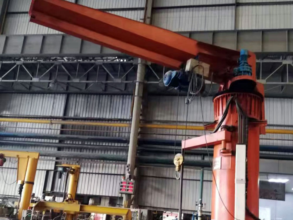 悬臂吊起重机工作强度为轻型,起重机由立柱,回转臂回转驱动装置及电动葫芦组成,立柱下端通过地脚螺栓固定在混凝土基础上,由摆线针轮减速装置来驱动悬臂回转,电动葫芦在悬臂工字钢上作左右直线运行,并起吊重物。起重机旋臂为空心型钢结构,自重轻,跨度大,起重量大,经济耐用。内置式行走机构,采用带滚动轴承的特种工程塑料走轮,摩擦力小,行走轻快;结构尺寸小,特别有利于提高吊钩行程。